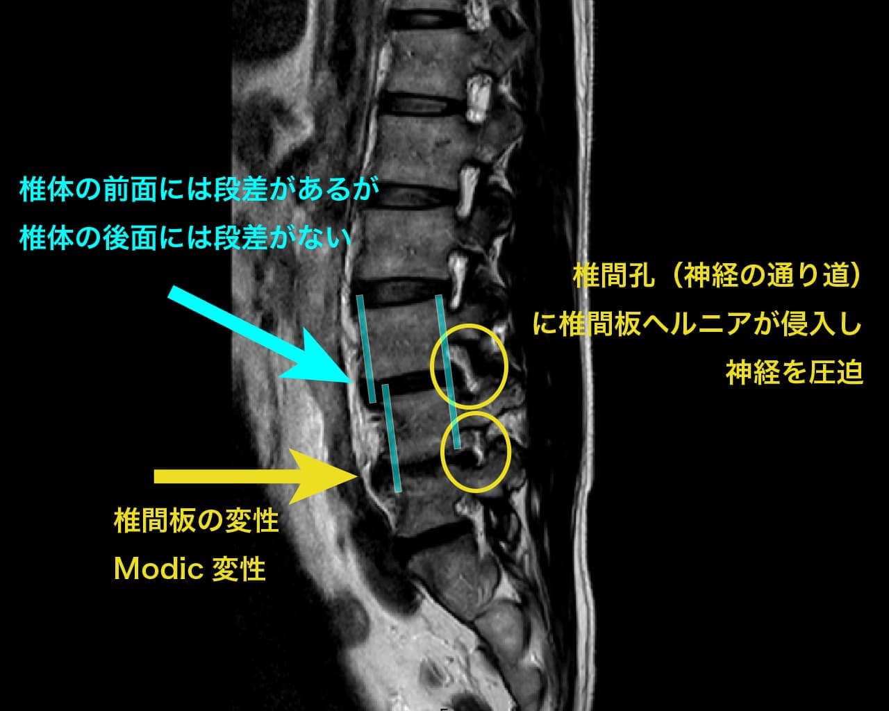 MRI画像から拝見するにL3/4、L4/5の椎間板ヘルニアと椎間孔の圧迫がありました。特にModic変性のあるL4/5の椎間孔が狭く、中を走る神経の圧迫はかなり高い確率で起こっていそうです。