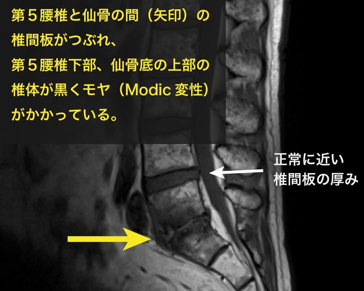 画像を拝見すると第5腰椎と仙骨の間の椎間板が消失するくらいに潰れている。椎間板変性はModic変性のタイプ1といったところでしょうか。