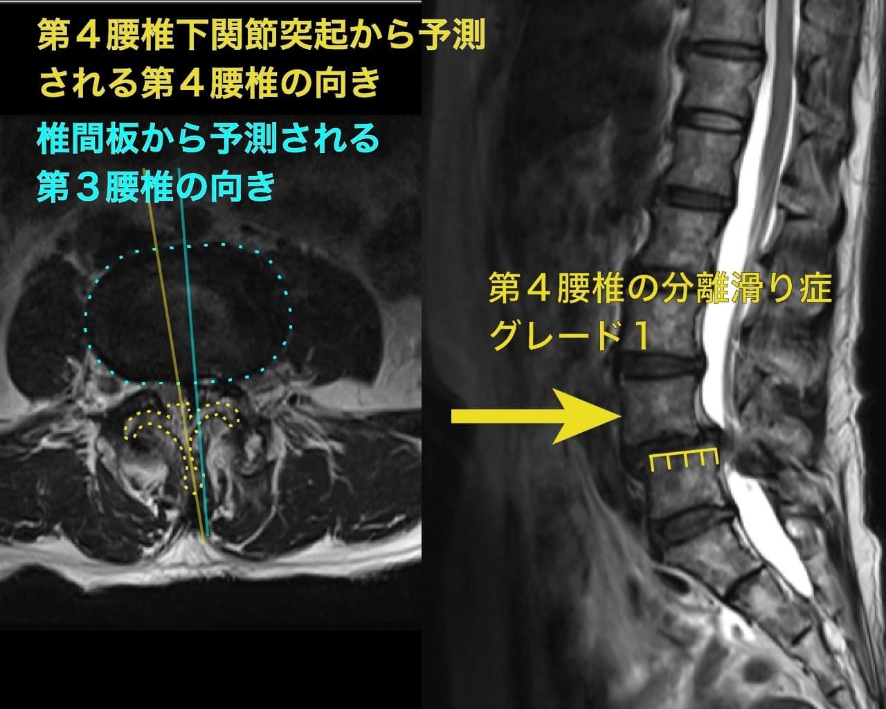 L3とL4の椎体前壁に段差があるため、一瞬滑り症も疑われますが、椎体後壁にはズレがないことから椎骨の回旋によって前壁の部分の前後がずれていたことが予測できます。(※個人的見解)