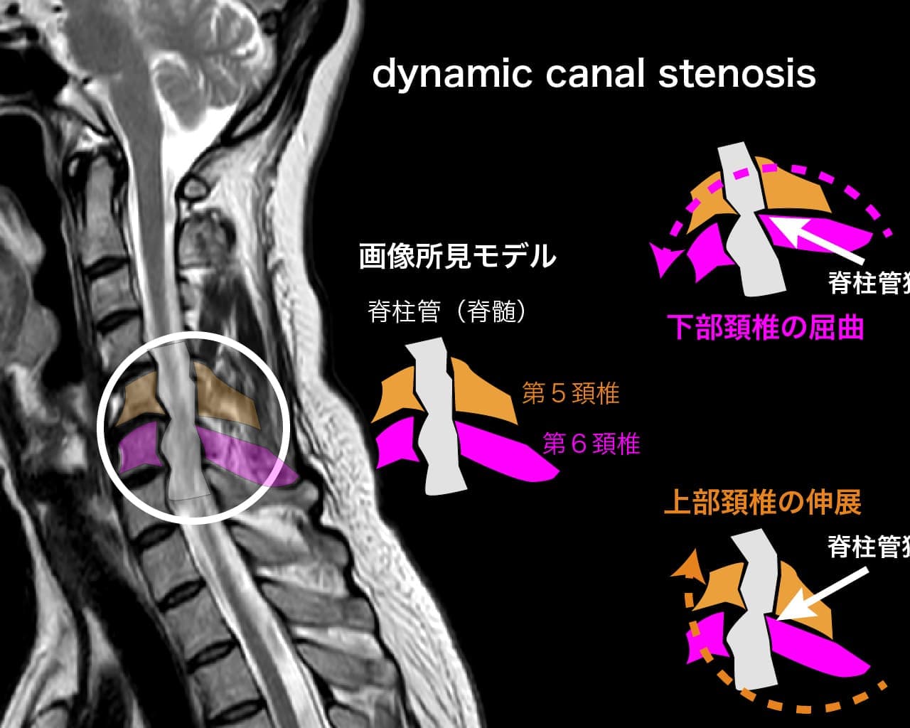 こちらの画像は実際に肩の痛みと痺れで来院されていた方の「首の脊柱管狭窄症」です。MRIではごく僅かなヘルニアと骨棘がありましたが、この場合は、首の動作で脊柱管が圧迫されるというpincer mechanismによるものでした。頚椎の可動性を正常に調整すると症状は消失しました。