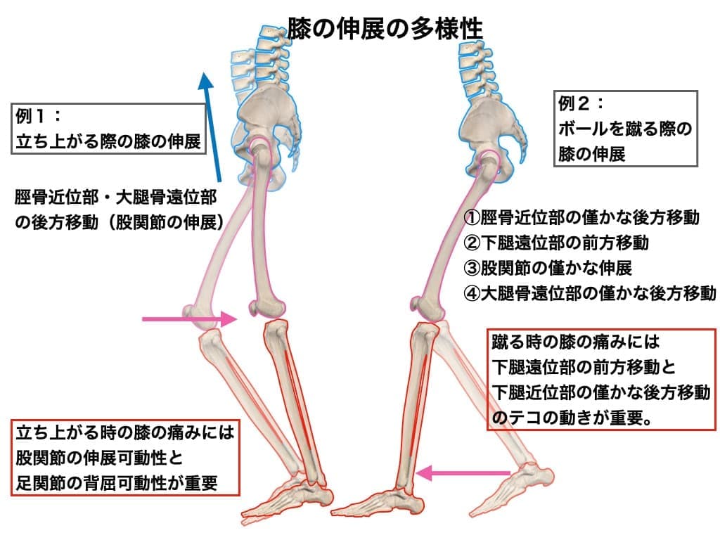 この動きとは違い、ボールを蹴るような動作における膝の伸展は、大腿骨が固定され、下腿遠位部が大きく前方に移動し、脛骨近位部は硬いの移動に遅れながら前方に動き、結果膝が伸展されます。