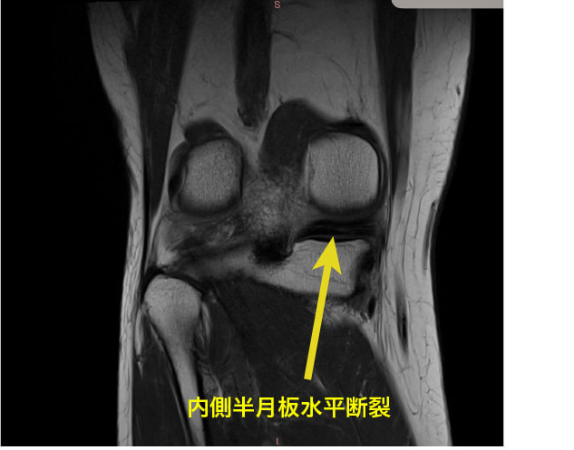 膝関節の方面のCOR画像(前額面)ですが、内側半月板の水平断裂が見られます。