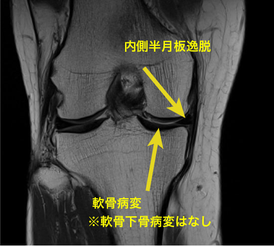 上記に紹介している膝のMRIは変形性膝関節症の原因の1つとして指摘されている、「内側半月板後根(後節)損傷MMPRT」の一症例です。