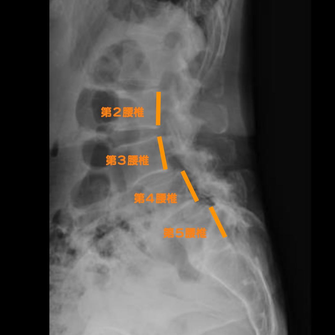L3とL4の椎体前壁に段差があるため、一瞬滑り症も疑われますが、椎体後壁にはズレがないことから椎骨の回旋によって前壁の部分の前後がずれていたことが予測できます。(※個人的見解)