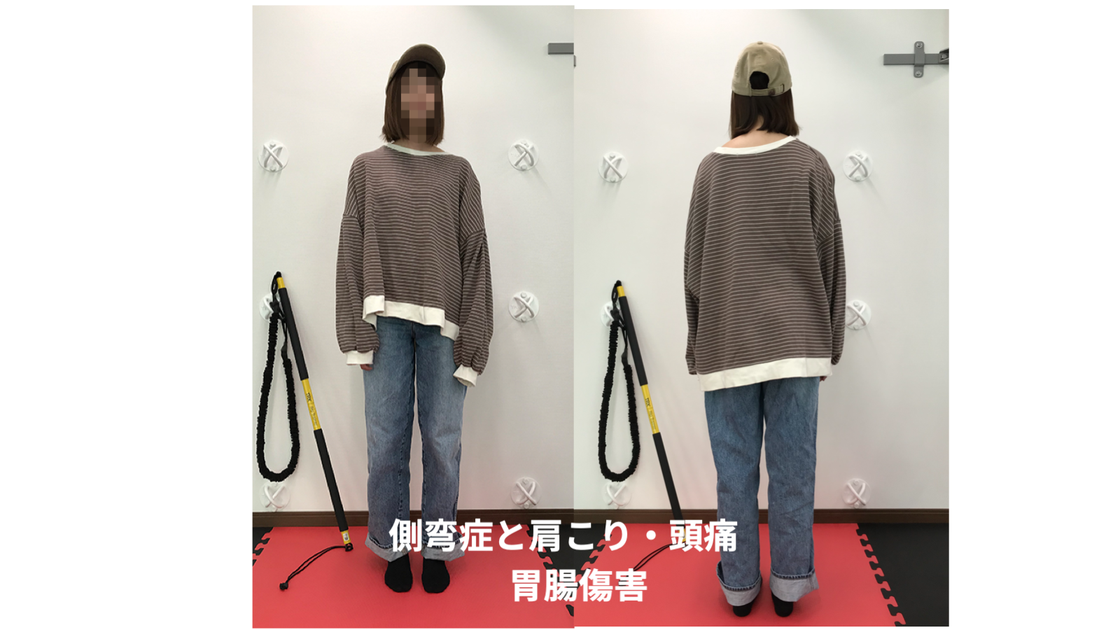 腰部からも側弯は強く起こっており、胃腸と付着する部位から改善させ、全体的な肩のバランスの調整を行って肩こりや頭痛を改善させました。