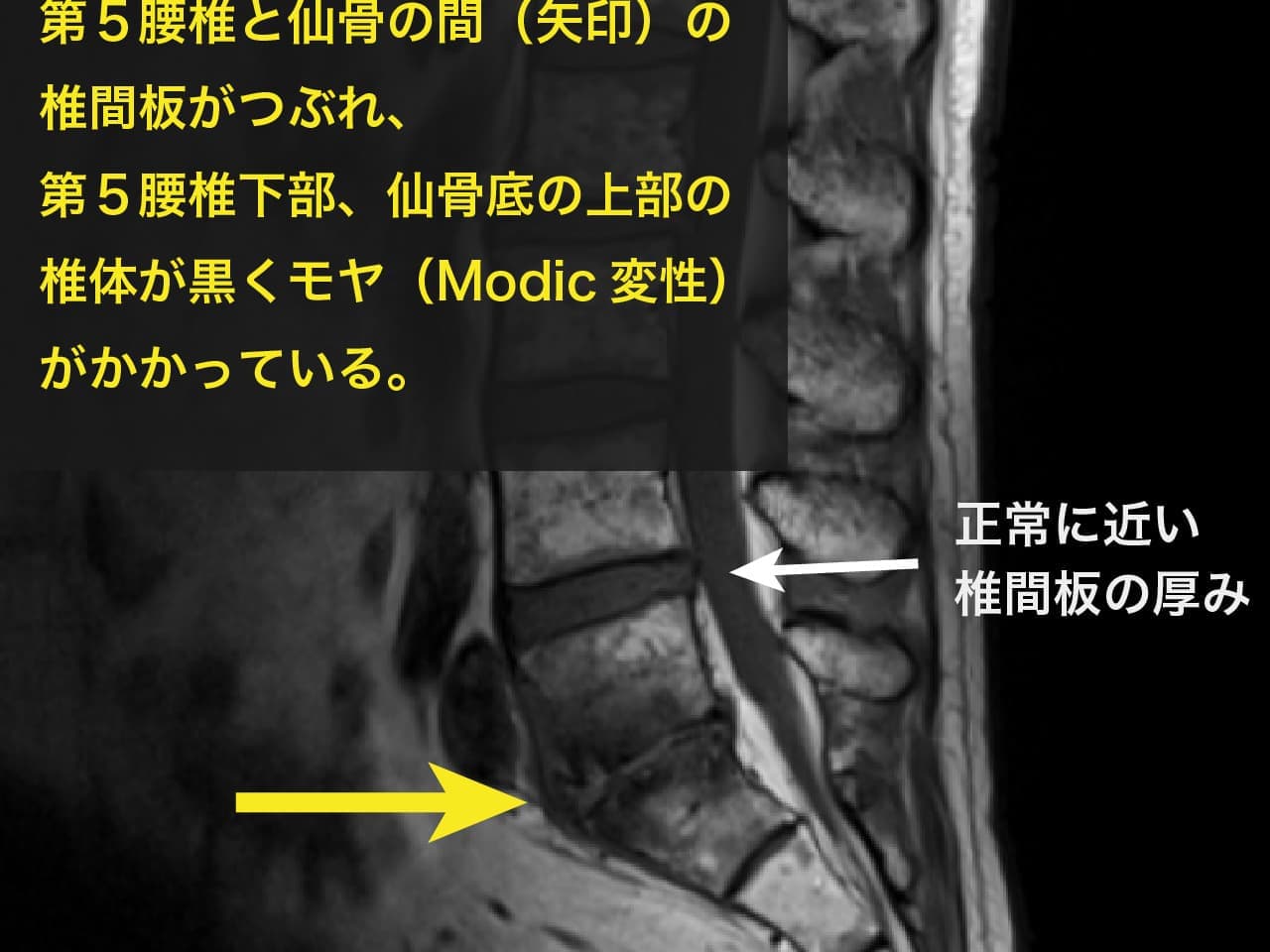 この方は、仙腸関節の痛みで来院された方ですが、MRIを拝見する限り、腰仙関節(第5腰椎と仙骨)の椎間板が完全に潰れてしまい、Modic変性と呼ばれる椎体の変性まで始まっていました。
